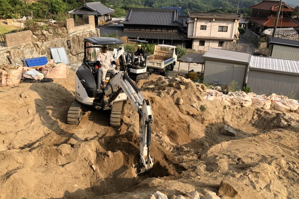 急斜面や崩壊しそうな家の裏等の山を伐採・掘削してその削った斜面に水路等をつけます。法枠工を施工し、安心して生活できるよう法面をつくります。