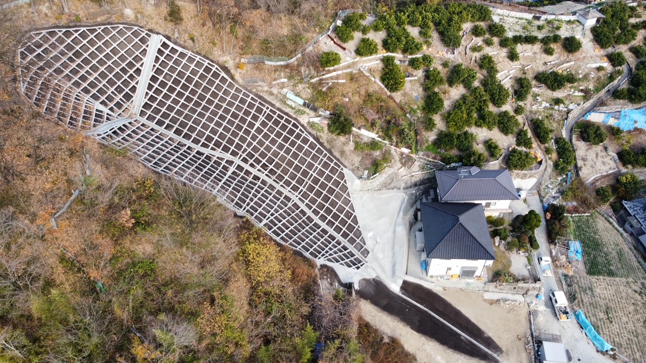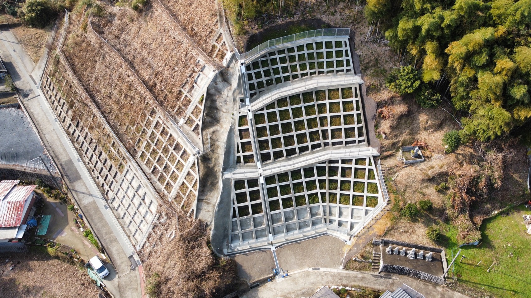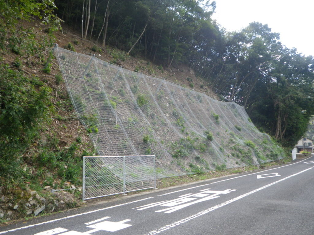 道路建設や宅地造成などの開発をする際に、山を削ったり、土を盛ったりすることにより造られる人工斜面や、自然斜面の事を法面といい、この斜面がくずれたり落石したりしないよう、予防・保護するための工事を法面工事と言います。 法面工事には落石を予防するロックネット工法、植物により斜面を保護する法面緑化工法、モルタルを使い保護する法枠工法や吹付工法・アンカー工法などたくさんの工法があります。 斜面の状態と工事の目的を考慮し工法は決められます。ひとたび土砂災害や落石災害が発生すると、人や建物・施設に重大な被害を与えることがあるため、法面工事は斜面防災上非常に重要なものです。
